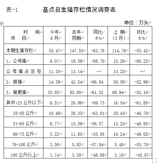 据沭阳等九个基点县八月末调查,九个县总存栏53.47万头,比去年同期147.53万头下降63.76%,比上期114.78万头下降53.42%;公母猪存栏6.07万头,比去年同期19.39万头下降68.70%,比上期15.26万头下降60.22%;苗猪存栏14.38万头,比去年同期42.34万头下降66.04%,比上期30.58万头下降52.98%;育肥猪存栏33.02万头,比去年同期85.80万头下降61.52%,比上期68.94万头下降52.10%。育肥猪分档结构中,50公斤以下存栏16.79万头,比上年同期49.19万头下降65.87%,比上期36.97万头下降54.58%,50公斤以上大猪存栏16.23万头,比去年同期36.61万头下降55.67%,比上期31.97万头下降 49.14%,。(详见表-1)