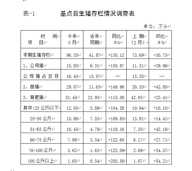 据沭阳等八个基点县五月末调查,八个县总存栏96.35万头,比去年同期41.87万头和上期73.69万头分别上升130.12%和30.75%;公母猪存栏15.83万头,比去年同期6.31万头和上期11.31万头分别上升150.87%和39.96%;苗猪存栏29.07万头,比去年同期11.63万头和上期20.35万头分别上升149.96%和42.85%,;育肥猪存栏51.45万头,比去年同期23.93万头和上期42.03万头分别上升115.00%和22.41%。育肥猪分档结构中,50公斤以下存栏27.85万头,比上年同期13.42万头和上期24.75万头分别上升107.53%和12.53%;50公斤以上大猪存栏23.60万头,比去年同期10.51万头和上期17.28万头分别上升124.55%和36.57%。(详见表-1)