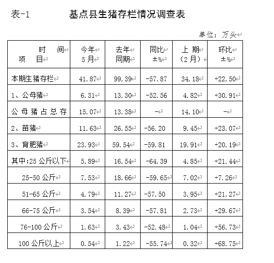 据沭阳等八个基点县五月末调查,八个县总存栏41.87万头,比去年同期99.39万头下降57.87%,比上期34.18万头上升22.50%;公母猪存栏6.31万头,比去年同期13.30万头下降52.56%,比上期4.82万头上升30.91%;苗猪存栏11.63万头,比去年同期26.55万头下降56.20%,比上期9.45万头上升23.07%;育肥猪存栏23.93万头,比去年同期59.54万头下降59.81%,比上期19.91万头上升20.19%。育肥猪分档结构中,50公斤以下存栏13.42万头,比上年同期35.20万头下降61.88%,比上期11.87万头上升13.06%,50公斤以上大猪存栏10.50万头,比去年同期24.31万头下降56.81%比上期8.04万头上升30.60%。(详见表-1)
